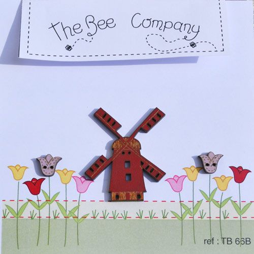 3 boutons décoratifs en bois peint, le mopulin mesure 4x5 cm et les fleurs 1 c de diamètre environ.