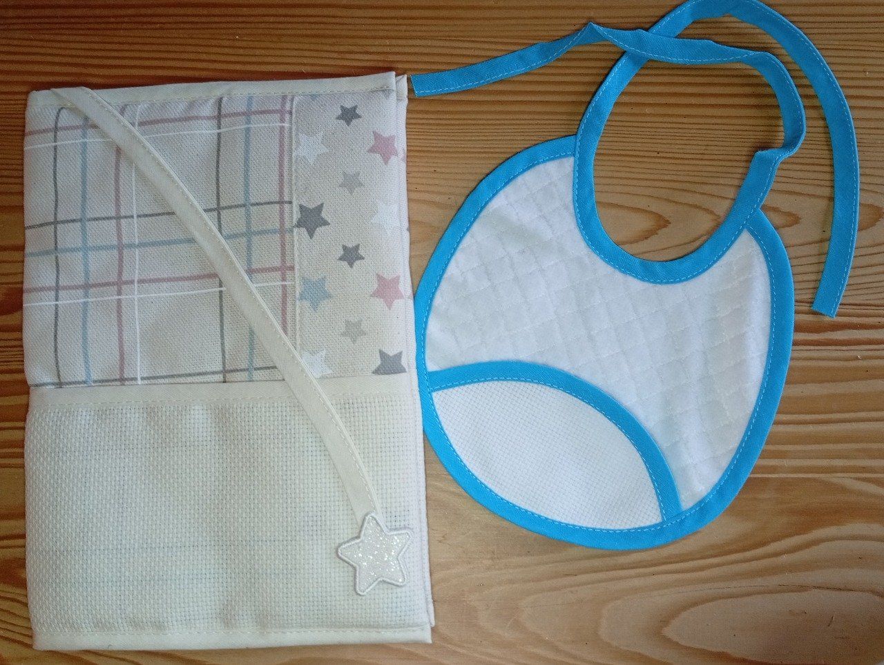 Lot comprenant un protège carnet de santé avec une bande à broder en aïda et un petit bavoir pour bébé 11x17 cm